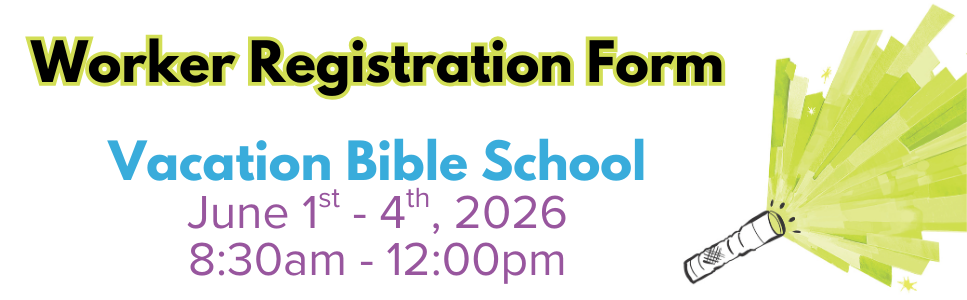 Thank you for serving at VBS! Please complete the form below. Please remember to register your children on the Worker's Child Registration Form. Childcare is available for workers' children who are younger than kindergarten.